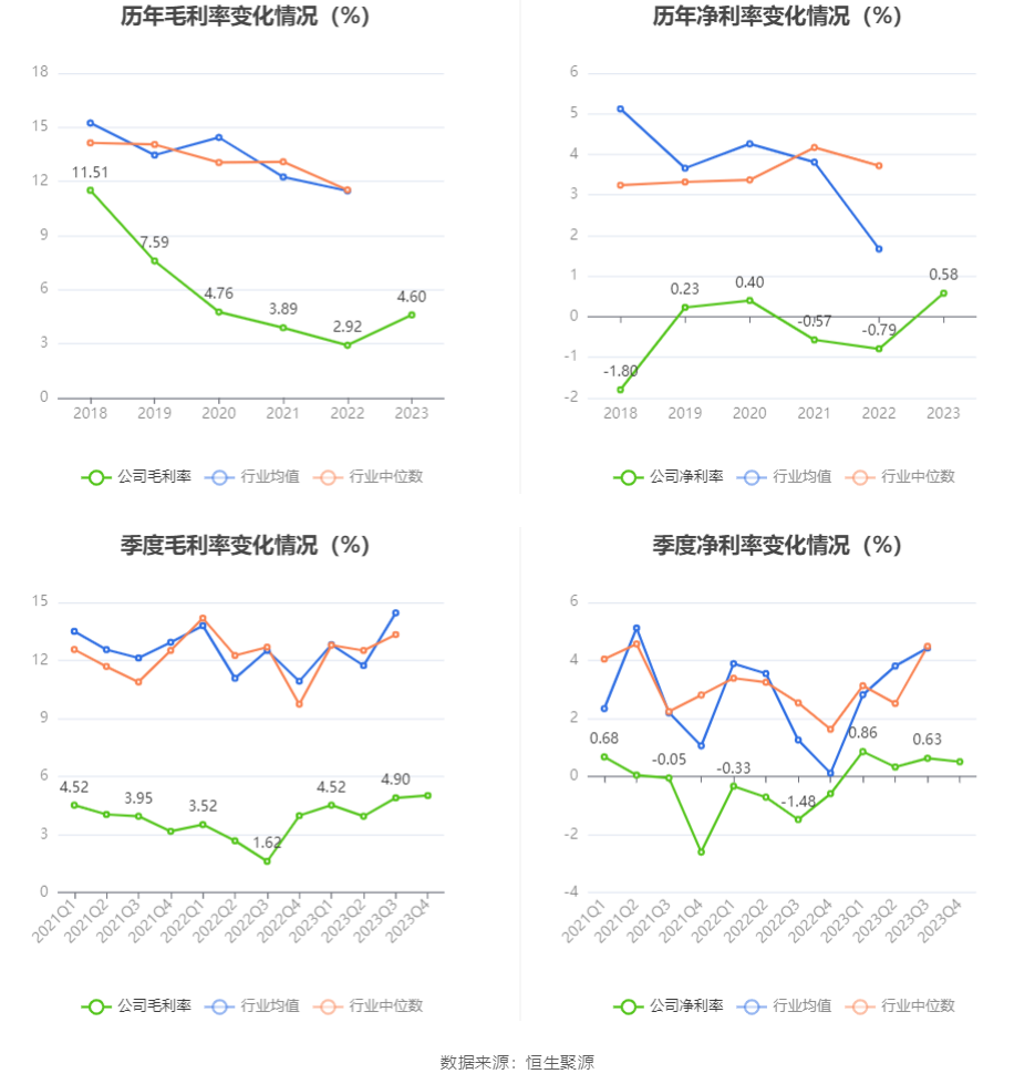 2023年,公司毛利率为4.60%,同比上升1.68个百分点;净利率为0.58%,较上年同期上升1.37个百分点。从单季度指标来看,2023年第四季度公司毛利率为5.02%,同比上升1.04个百分点,环比上升0.12个百分点;净利率为0.51%,较上年同期上升1.10个百分点,较上一季度下降0.12个百分点。