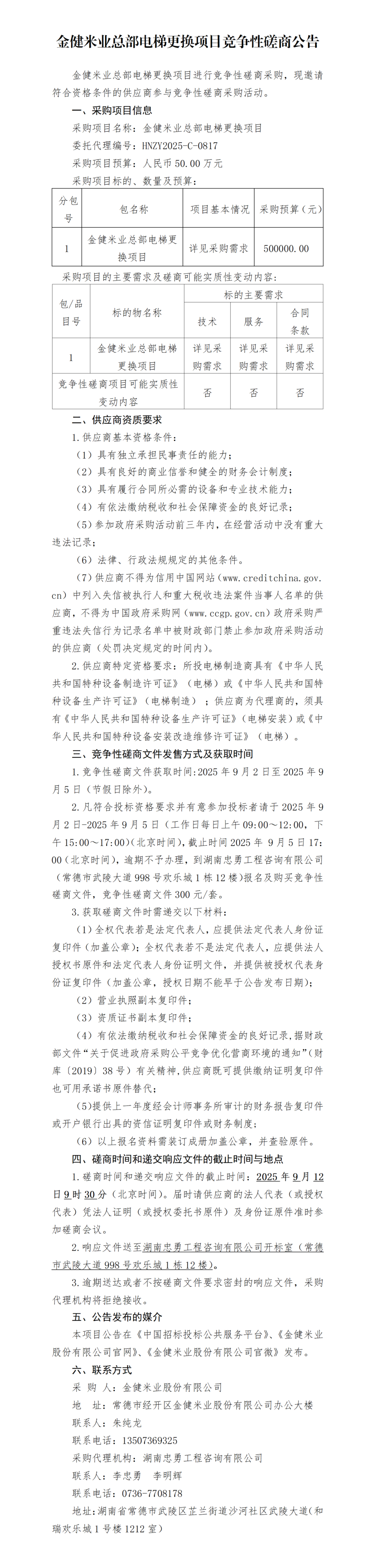 金健米业总部电梯更换项目竞争性磋商公告