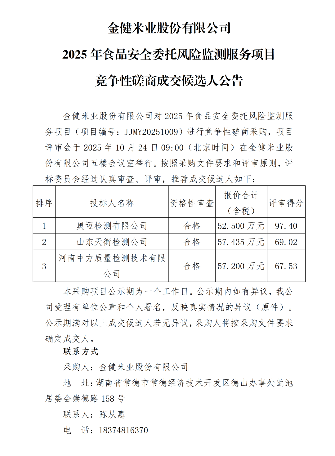 金健米业股份有限公司2025年食品安全委托风险监测服务项目竞争性磋商成交候选人公告