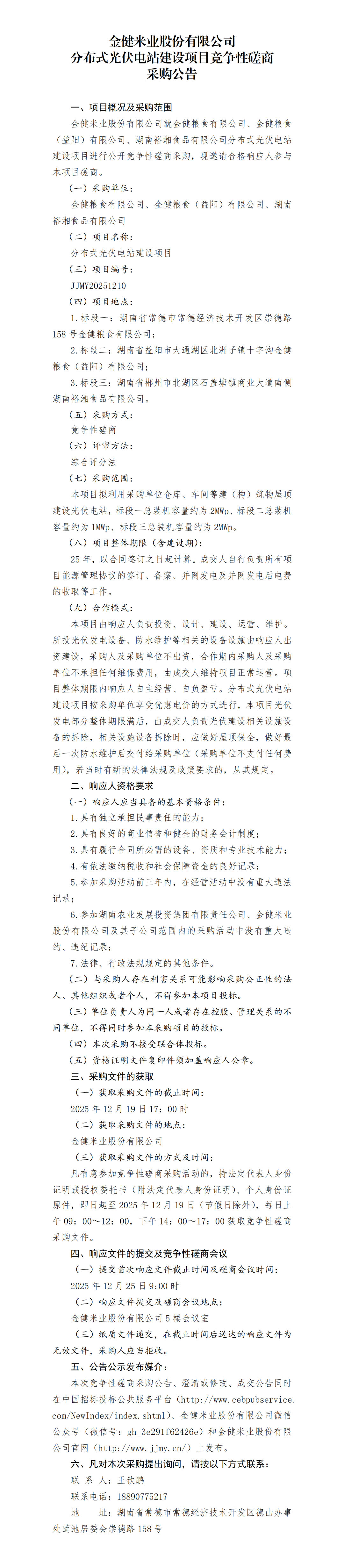 金健米业股份有限公司分布式光伏电站建设项目竞争性磋商采购公告