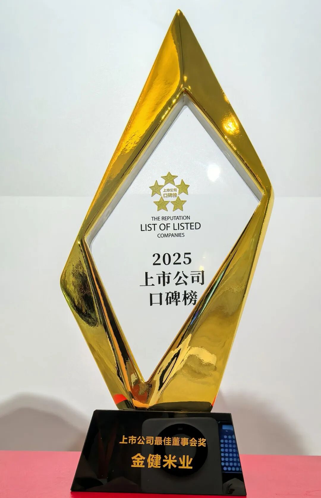 12月11-12日,由《每日经济新闻》主办的“2025第十四届中国上市公司发展年会”在海口举行。12日晚,主题为“智创未来价值领航”的“2025第十五届中国上市公司口碑榜”荣耀揭榜, 金健米业 董事会凭借在卓越公司治理、长期价值创造、产业创新突破、践行社会责任等方面的突出表现,荣膺“最佳上市公司董事会”殊荣。