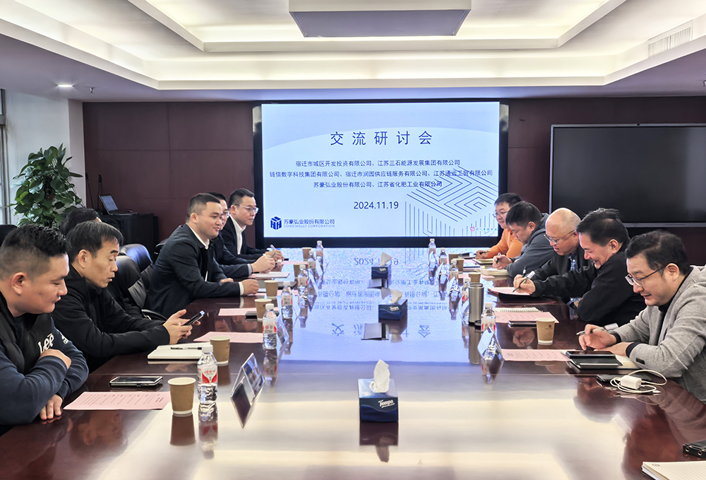 11月19日下午,宿迁市城区开发投资有限公司、宿迁市润园供应链服务有限公司、链信数字科技集团有限公司、江苏三石能源发展集团有限公司、江苏通远工贸有限公司领导一行到访苏豪弘业。苏豪弘业股份有限公司党委书记、董事长马宏伟,江苏省化肥工业有限公司总经理高亮及相关部门负责人出席业务交流研讨。