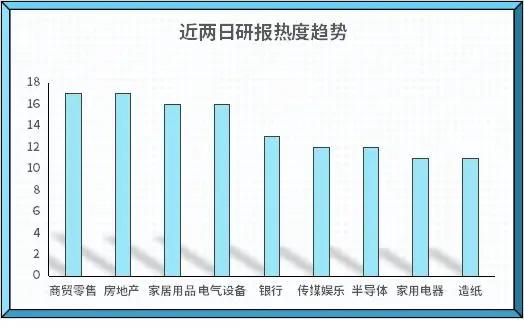 在近两日统计的320份个股及行业研报中,商贸零售、房地产相关研报占比最高,为5.31%,其次为家居用品、电气设备行业相关研报。研报覆盖较多的个股有欧派家居(603833)、特步国际(01368.HK)、百亚股份(003006)、天味食品(603317)、平安银行(000001)、陕西煤业(601225)。
