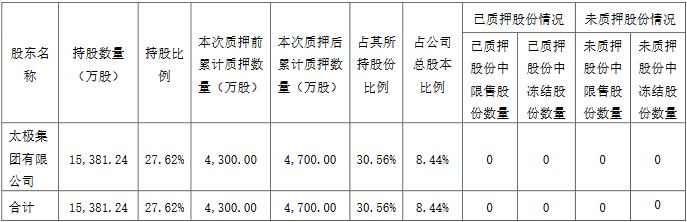 根据公告,太极有限持有太极集团股份15,381.24万股,占太极集团总股本的27.62%。本次质押后,太极有限及其一致行动人累计质押股份4,700万股,占其所持太极集团股份的30.56%,占太极集团总股本的8.44%。