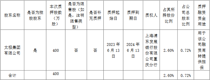 太极集团(600129.SH)昨日晚间披露公告称,公司于昨日接控股股东太极集团有限公司(以下简称:太极有限)通知,获悉其所持有公司部分股份办理了质押登记手续。太极有限本次质押太极集团400万股,占其所持股份比例2.60%,占太极集团总股本比例0.72%,质押起始日为2023年6月13日,质押到期日为2024年6月13日,质押融资资金用于该公司融资周转提供担保。
