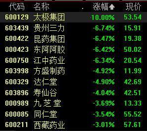 7月3日,中药板块集体下挫,太极集团跌停,成交额6.40亿元。贵州三力、昆药集团、东阿阿胶等多股跌超6%。