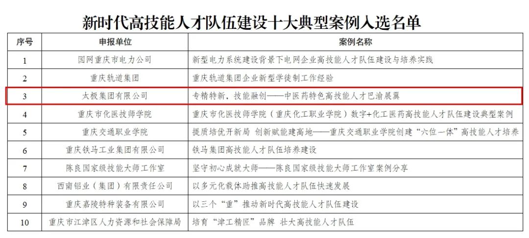 4月17日,重庆市人社局发布“关于公布全市职业能力建设领域项目案例和‘最美巴渝工匠’名单的通知”,公布了系列职业能力建设项目、人才队伍建设案例以及“最美巴渝工匠”等名单。其中,太极集团《专精特新,技能融创——中医药特色高技能人才巴渝展翼》入选新时代高技能人才队伍建设十大典型案例。