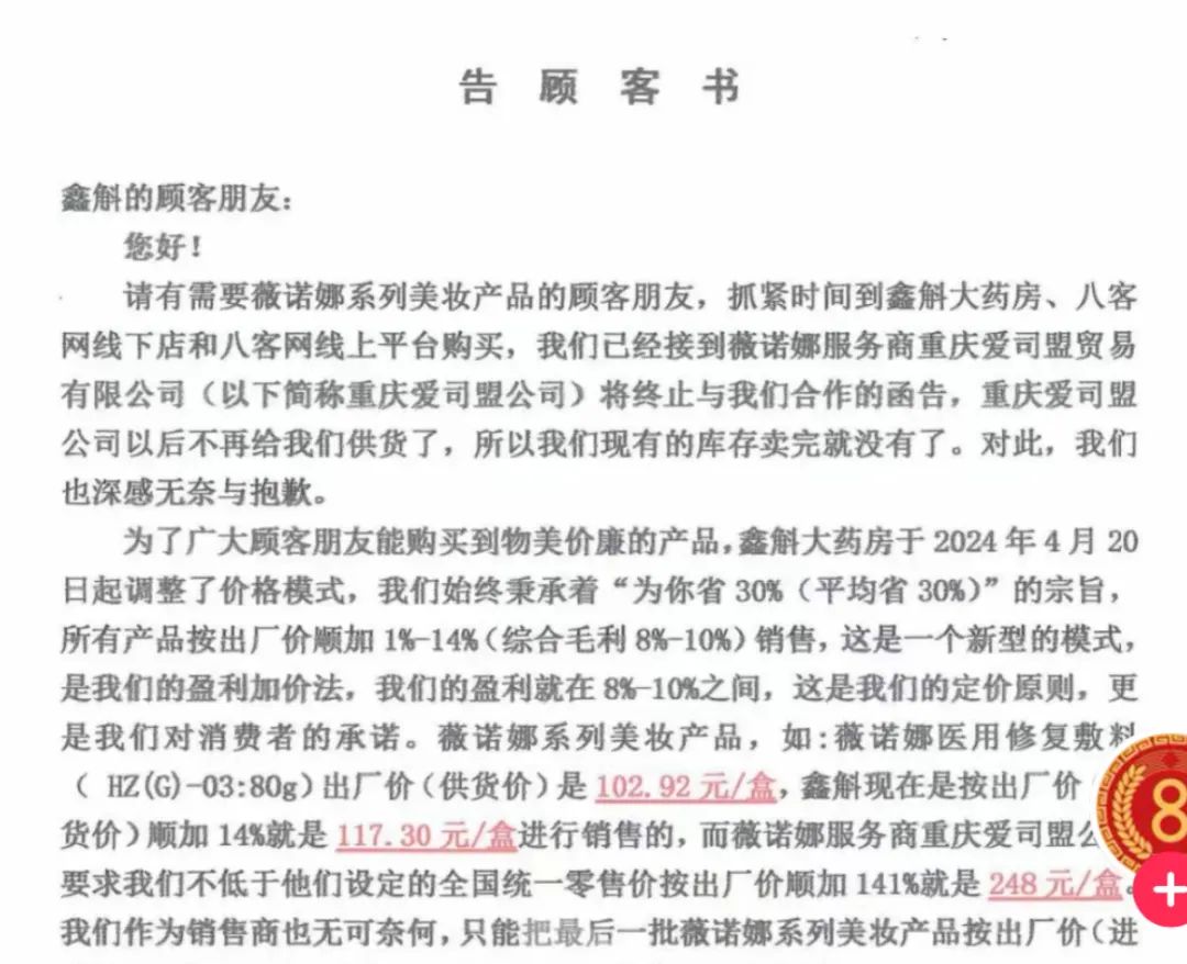 鑫斛药房发布的《告顾客书》,涉及薇诺娜产品