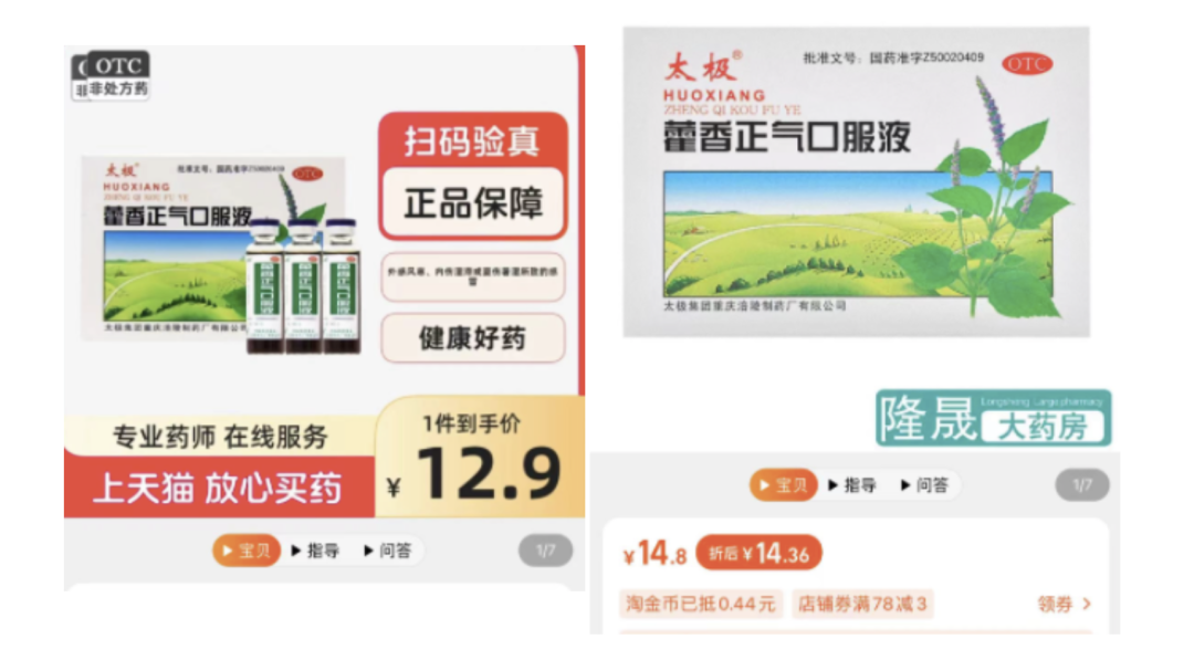 红星资本局发现,太极藿香正气口服液的销售价格,线上线下渠道均存在差异。线下渠道价格较为统一,太极集团旗下的“太极大药房”售价为13元/盒(5支装)。线上渠道则价格不一,天猫平台显示,最低有商家卖到12.9元/盒(5支装),最高也有商家卖到16元/盒。