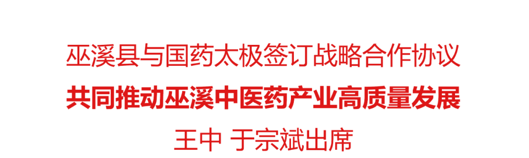 2月24日,巫溪县人民政府与国药太极签订战略合作协议,共同推动巫溪中医药产业高质量发展。巫溪县委副书记、县长王中,国药太极股份党委副书记、总经理于宗斌出席签约仪式。巫溪县副县长唐奇利,国药太极股份副总经理陈康参加。