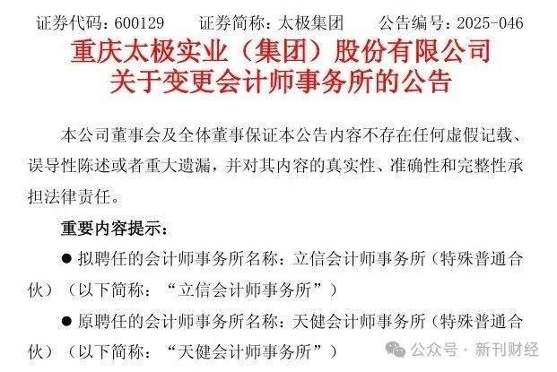 7月8日,太极集团发布公告,宣布拟聘请立信会计师事务所作为其2025年度财务报告及内部控制的审计机构。此前,天健会计师事务所一直担任其审计工作,并在2024年度为太极集团出具了标准无保留意见的审计报告。