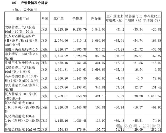 从产品维度剖析,太极集团核心产品表现偏弱。以10ml×10支×70盒规格的太极藿香正气口服液为例,其年度销量达9236.79万盒,但同比降幅达35.34%,产量下滑幅度更甚,同比下降51.2%。此外,太极集团在抗感染、解热镇痛、镇咳祛痰及体液补充等重点治疗领域的主力产品,如注射用头孢唑肟钠、复方对乙酰氨基酚片、复方甘草片及氯化钠注射液等,均面临销量下滑的挑战,核心产品矩阵整体承压。