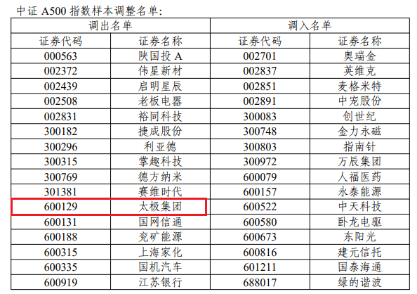 中证A500指数样本调整名单显示, 太极集团 (600129.SH)为中证A500指数样本调出样本之一。