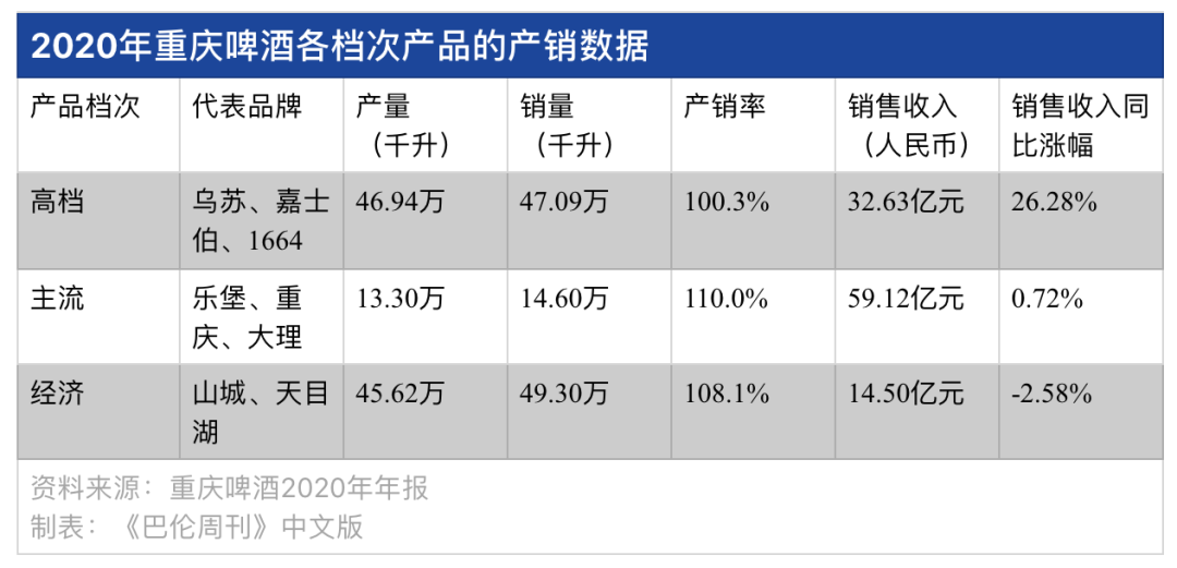 2020年财报显示,重组后的重庆啤酒成为嘉士伯在中国运营啤酒资产的唯一平台。由此,即便去年的啤酒市场受疫情所困缺乏消费场景,“本地品牌+国际品牌”的策略依然支撑重庆啤酒的销量、营业收入均实现增长,2020年重组后的总资产和营收均达人民币100亿元级别。