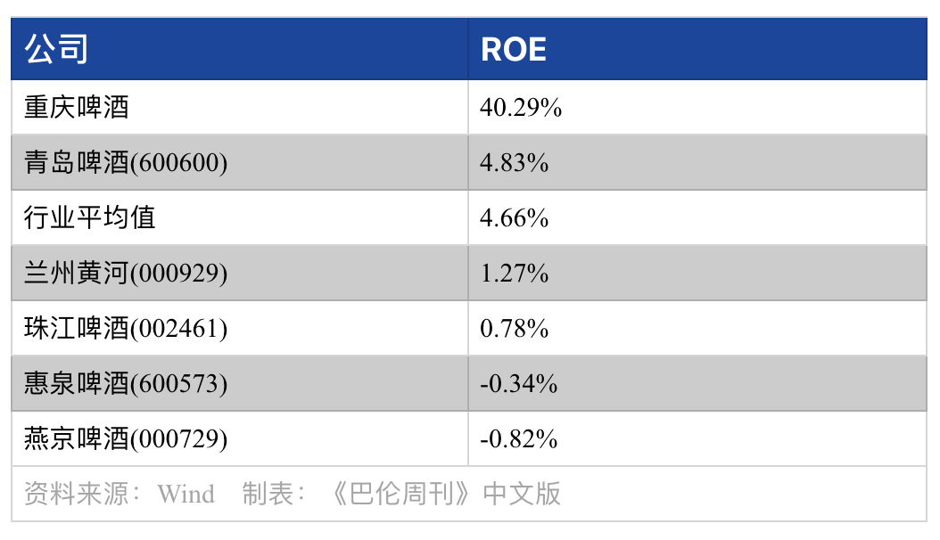 同时,2021年一季报,重庆啤酒的净资产收益率(ROE)达40.29%,大幅度高于同业平均值。