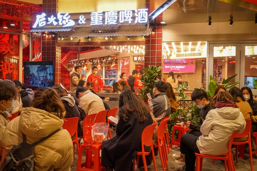 ▲上海消费者在后火锅&重庆啤酒体验店外排队等候吃火锅。重庆啤酒供图