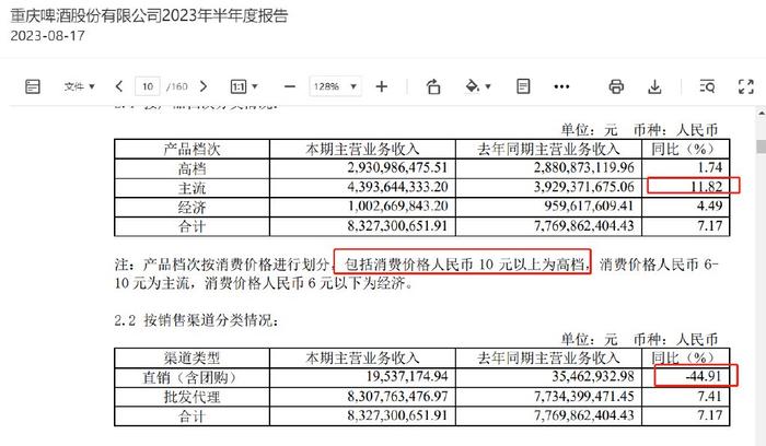 重庆啤酒2023年的中报显示,价格10元以上高档啤酒销售同比仅增长1.74%,而6到10元的主流产品销售同比增长11.82%。也就是说,高档产品的增长正在减速,而中低档产品却在猛增。