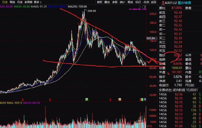 从走势来看,重庆啤酒目前处于高位三角形整理的末端底部区域,短线反弹,120日K线将是重要阻力位。不过,随着临近三角形末端,其选择向上还是向下的时间也不远了。有网友在股吧里调侃道:“可以梭哈了,各位家人。”
