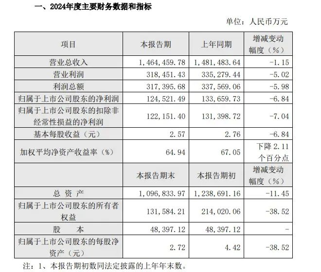 报告期内,该公司实现营业总收入146.45亿元,同比减少1.15%;实现利润总额31.74亿元,同比减少5.98%;实现归属于上市公司股东的净利润约12.45亿元,同比减少6.84%。