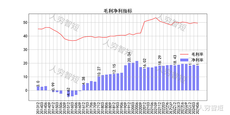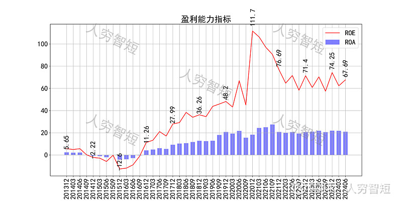 最近十年营收规模复合增长率约为14.97%,到24年6月末,TTM营业收入为151.71亿元,行业排名第5。成本费用端构成来看,营业成本、销售费用占据主要地位,成本端主要为66%的原材料及各10%左右的人工费用、制造费用;销售端主要为接近50%的广告及市场费用、25%左右的工资薪酬。整体毛利率震荡走高,近年来维持较高水平,净利率同步波动,未看到继续上行趋势。各项费用控制一般,销售费用占比持续增加,带动整体成本费用占比缓慢增长。盈利指标ROE、ROA显示,盈利能力维持高位震荡,最新ROE在67.69%左右。