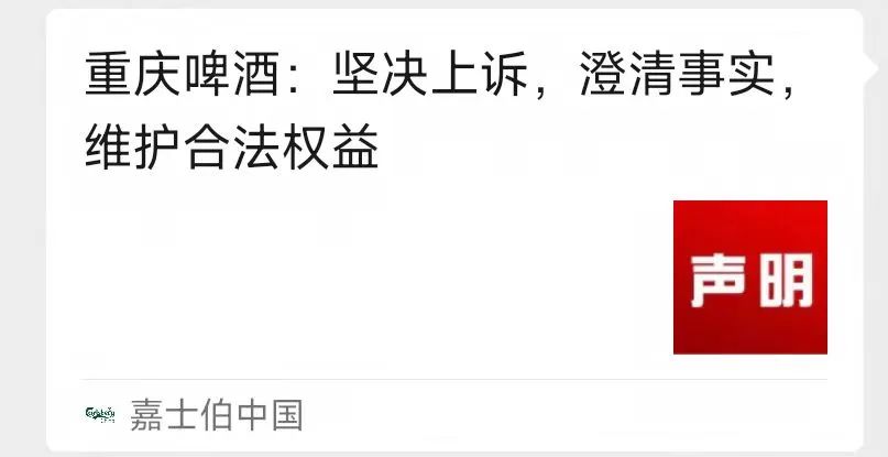 在一审做出判决后,嘉士伯中国公开发声,重庆啤酒已决定向重庆市高级人民法院提起上诉。