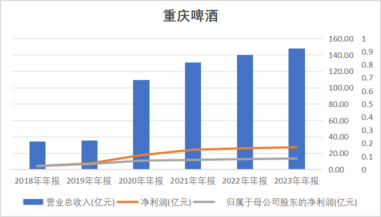2023年,重庆啤酒的营业收入为148亿元,比2022年增长5.53%。归属于上市公司股东的净利润为13.37亿元,较2022年增长了5.78%。