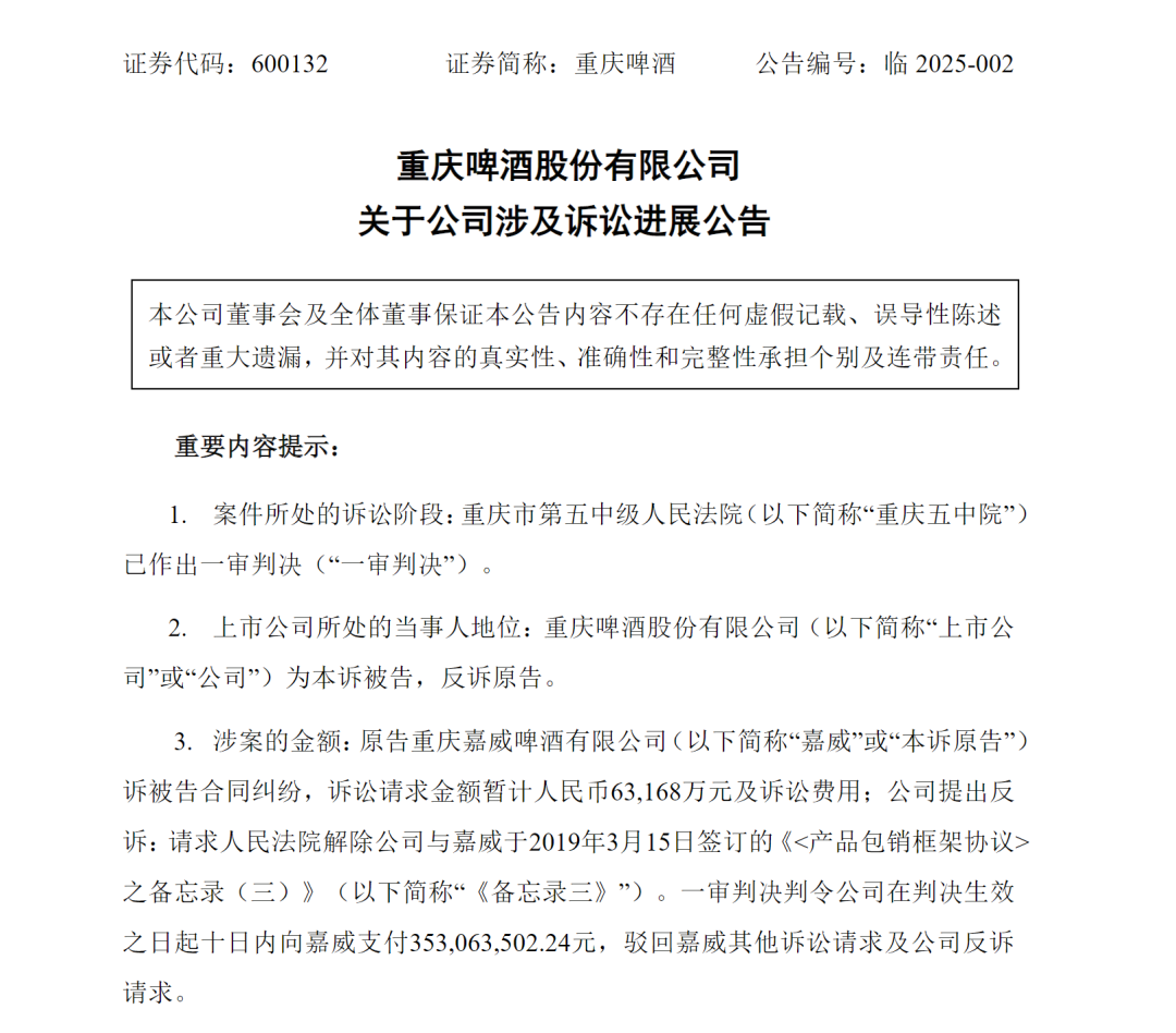 2025年3月14日,重庆市第五中级人民法院一审判决重庆啤酒败诉,需向嘉威赔偿3.53亿元,并驳回嘉威的其他诉讼请求及重庆啤酒的反诉请求。
