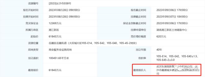 竞得人:武汉东湖高新集团股份有限公司、长沙市麓湘城乡建设发展投资有限责任公司(东湖高新&麓山控股)