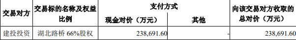 根据同致信德出具的资产评估报告(同致信德评报字(2023)第020144号),以2023年6月30日为评估基准日,本次交易采用资产基础法和收益法对湖北路桥股权价值进行评估,以收益法评估结果作为评估结论。截至评估基准日,湖北路桥采用收益法评估的扣除永续债后的股东全部权益价值为361,653.94万元,评估增值102,333.24万元,增值率39.46%。经交易双方友好协商,本次拟出售湖北路桥66%股权的交易作价为238,691.60万元,本次交易以现金方式支付。本次交易标的资产的资产评估报告已获得湖北联投备案。