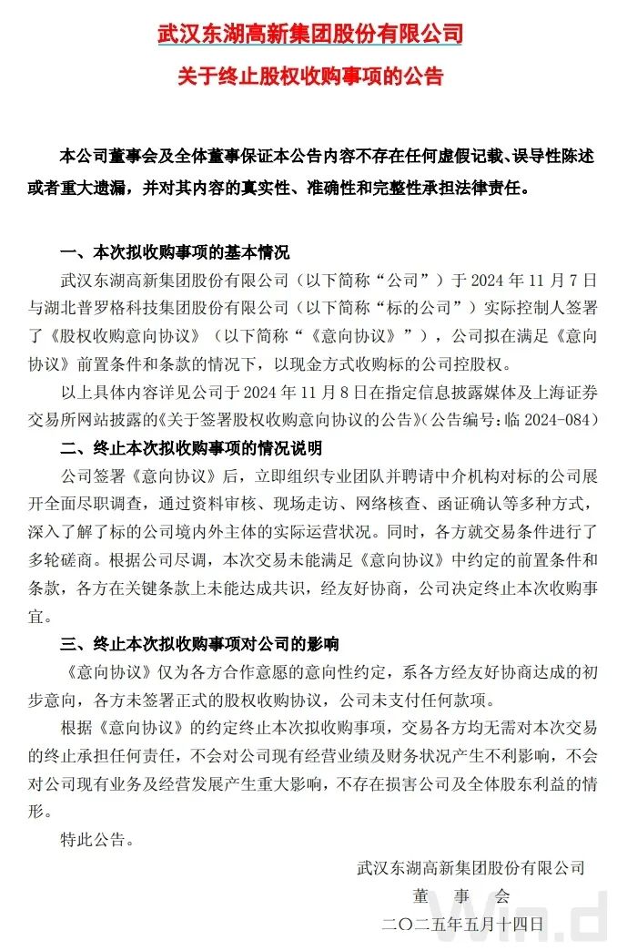 5月13日,东湖高新(600133.SH)发布公告称,因标的公司普罗格未能满足协议中的前置条件和条款,各方在关键条款上未能达成共识,经友好协商,公司决定终止本次收购事宜。