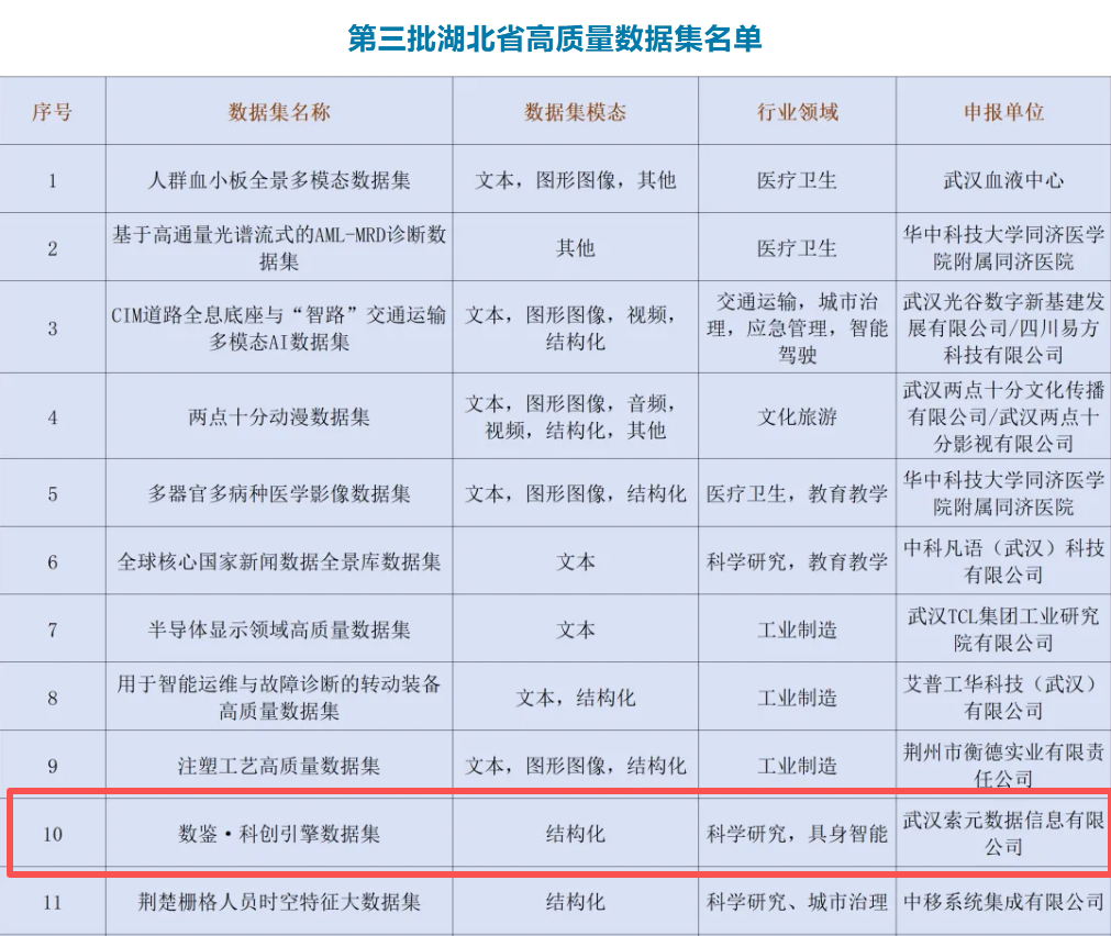 近日,湖北省数据局发布第三批湖北省高质量数据集名单,由湖北联投东湖高新集团旗下武汉索元数据信息有限公司自主研发的“数鉴?科创引擎数据集”成功入选,标志着该数据集在合规性、价值密度与应用潜力上获得省级权威认可,在全省数据要素市场化配置改革中交出亮眼答卷。