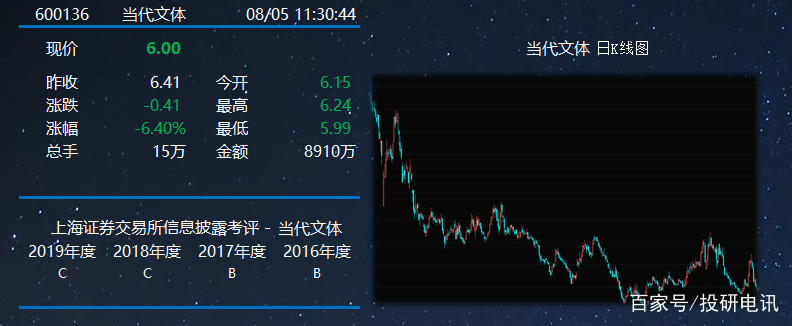 据投研电讯信披质量研究院统计,自上交所2016年度开展信息披露考评工作以来,当代文体于2016-2017年度、2017-2018年度在上交所信息披露考评曾连续两年获B;但在2018-2019年度信息披露考评由B下降为C后,已连续两年为C。