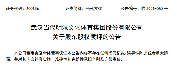 8月4日,武汉当代明诚文化体育集团股份有限公司(600136.SH,简称“当代文体”)发布股东质押公告,公司股东新星汉宜向华融资管湖北分公司质押170万股公司股份,用于补充流动资金。