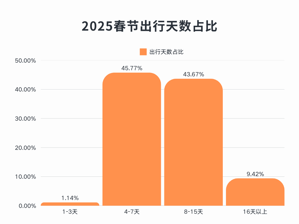 今年春节假期较以往增加了1天,长达8天的假期更是激发了大家的出游意愿。根据中青旅遨游旅行数据统计,8-15天长线游总体占比达43.67%,整体游客平均出行天数较去年同期有所增长,游客通过早出发、晚返回的拼假形式延长假期,沉浸式感受“诗与远方”的旅行。