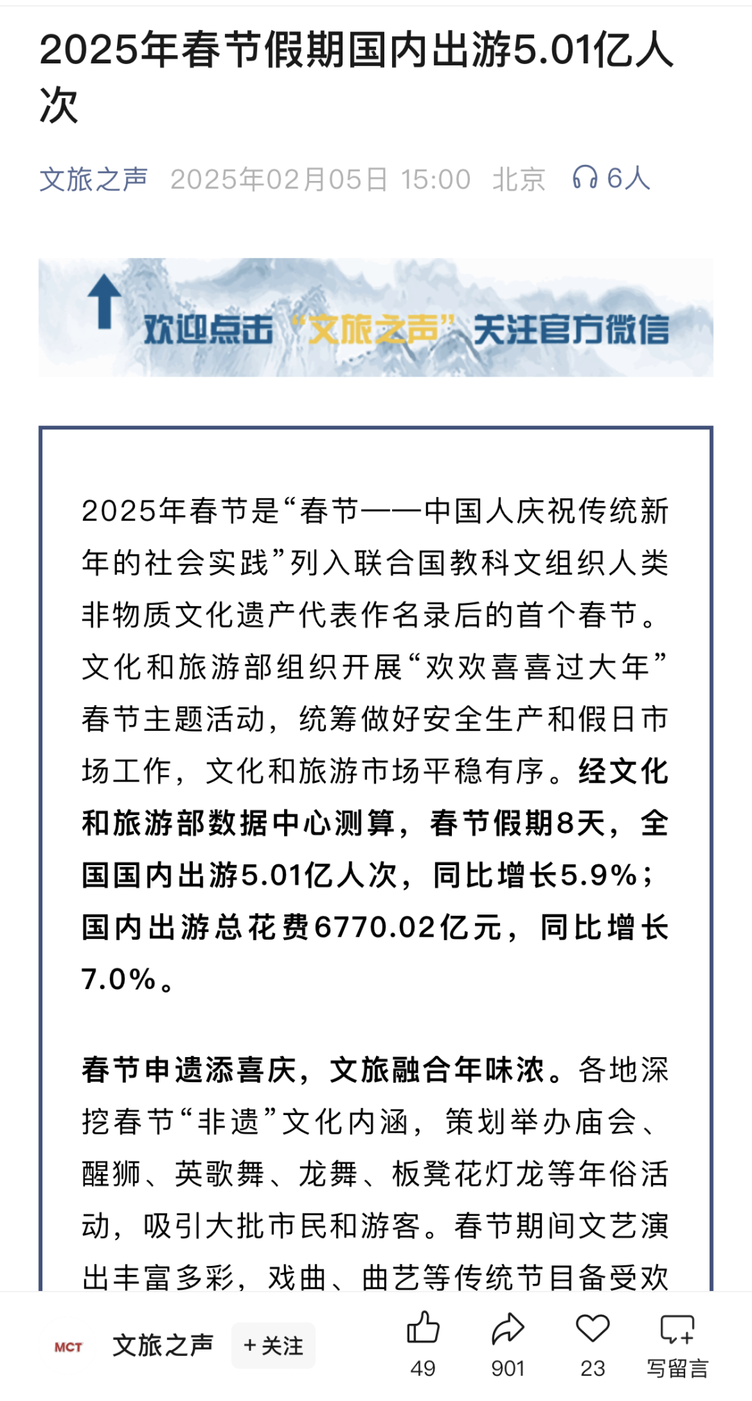 2025年春节黄金周落下序幕,据文化和旅游部官网消息,2025年春节假期8天,全国国内出游人数5.01亿人次,同比增长5.9%。国内出游总花费6770.02亿元,同比增长7.0%。入出境旅游市场数据再创新高,中国公民出境旅游者378.38万人次,同比增长5.2%,其中出国游客90.76万人次。