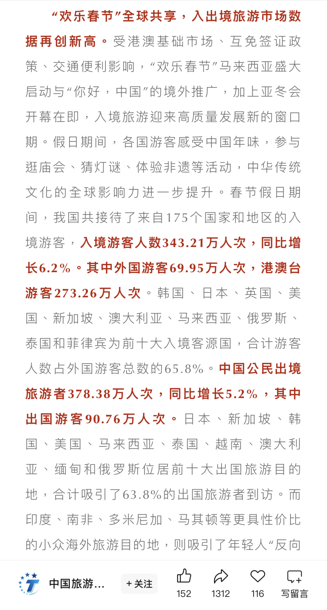 春节旅游市场繁荣发展,欣欣向荣,中青旅遨游旅行春节旅行度假业务量同比增长明显,整体业务量同比去年增长超三成,其中出境游业务量同比增长超40%,北非包机、南极包船等各类大型特色旅游项目圆满发团,自营出境团队的足迹遍及全球七大洲、四大洋100余个国家及地区。