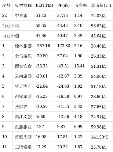 从行业市盈率排名来看,公司所处的旅游酒店行业市盈率平均52.55倍,行业中值47.56倍,中青旅排名第22位。