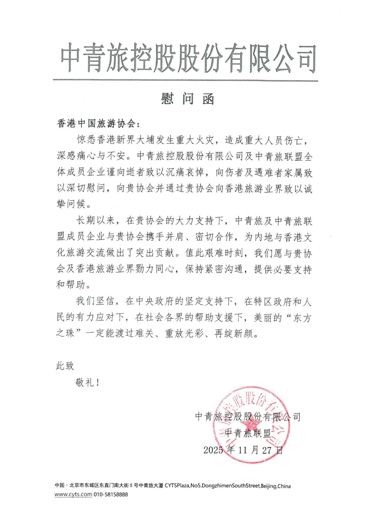 11月26日下午,香港新界大埔屋邨宏福苑多栋住宅楼发生火灾,造成重大人员伤亡。 中青旅 控股股份有限公司及 中青旅 联盟特向 香港中国旅游协会 致函慰问。