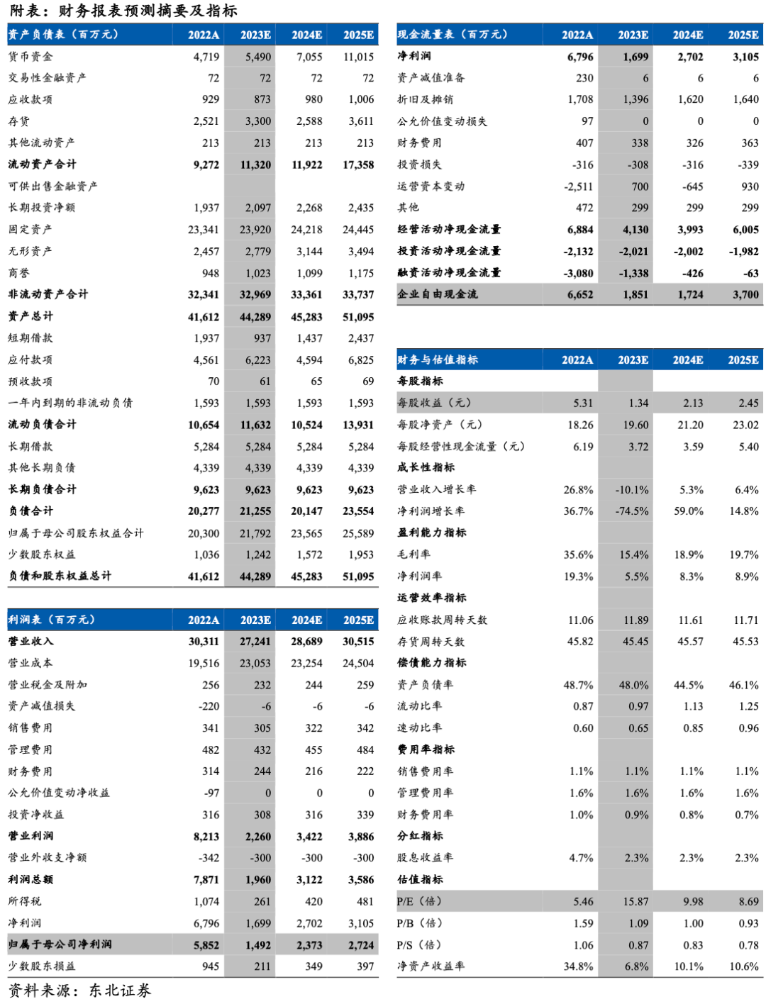 调整盈利预测,维持“买入”评级。预计公司23-25年实现营业收入272.41、286.89、305.15亿元(此前为225.87、282.92、306.62亿元),归母净利润14.92、23.73、27.24亿元(此前为24.81、29.01、33.20亿元),对应 PE 为 16X/10X/9X,维持“买入”评级。