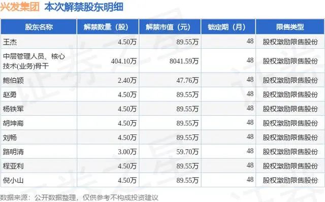 根据市场公开信息整理,兴发集团(600141)于11月13日将有441.0万股限售股份解禁上市,为公司股权激励限售股份,占公司总股本0.4%。最近一年内,该股累计解禁90.6万股,占总股本的0.08%。本次解禁后,公司还有93.9万股限售股份,占总股本0.08%。具体如下图所示: