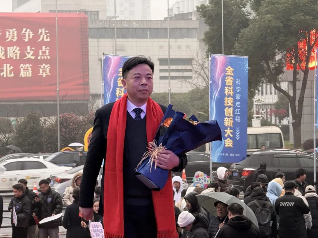 活动开始前,李书兵等12位科学家依次踏上红毯,这是湖北省第七年为科学家铺设百米红毯,见证着湖北科技创新的蓬勃脉动。