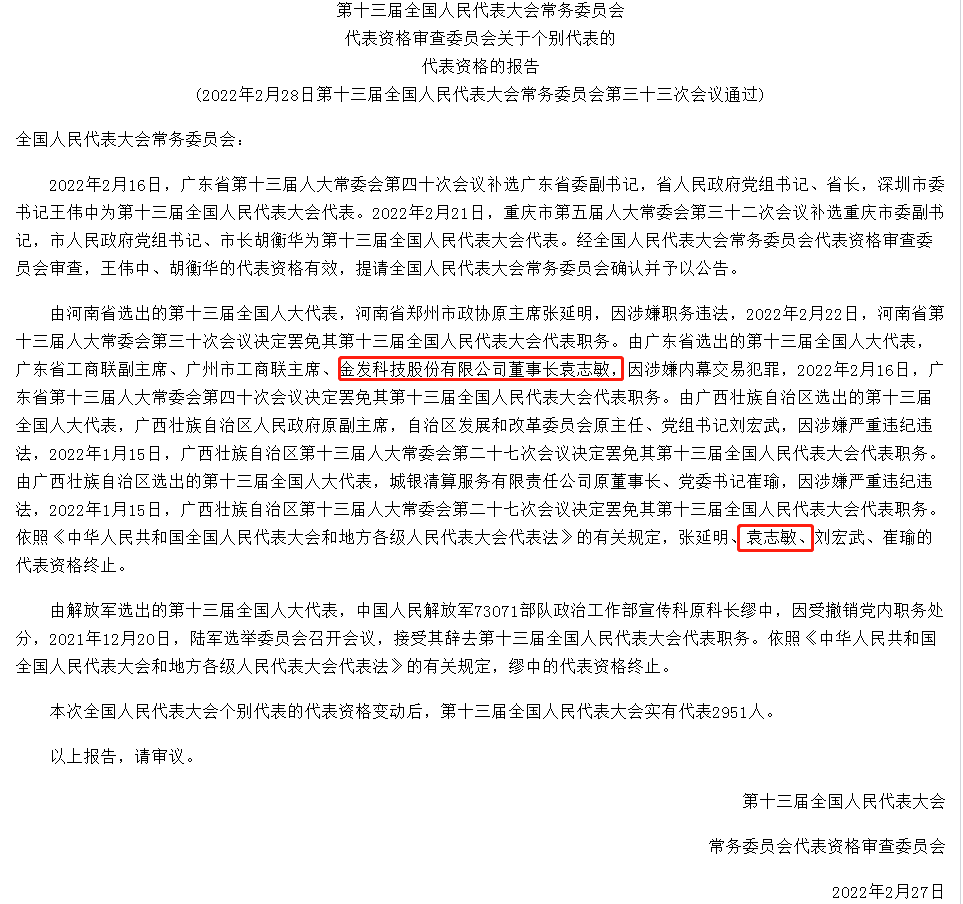 就在此次事件发生之前,2022年2月16日,由广东省选出的第十三届全国人大代表,广东省工商联副主席、广州市工商联主席、金发科技股份有限公司董事长袁志敏,因涉嫌内幕交易犯罪,广东省第十三届人大常委会第四十次会议上已经被罢免了其第十三届全国人民代表大会代表职务。