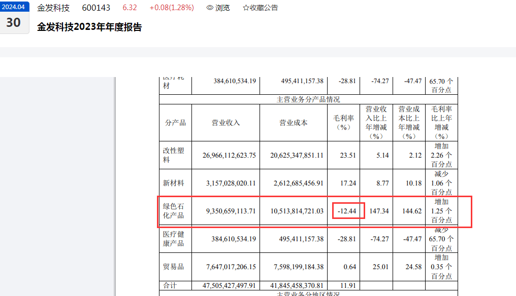 对于今年一季度盈利的持续大幅下滑,金发科技表示,绿色石化板块产品生产装置整体开工率不及预期,毛利下降。从去年度来看,绿色石化产品营收录得93.51亿元(营收占比排名第二),毛利率为-12.44%。根据资料,绿色石化产品包含丙烯、异辛烷、甲乙酮、液化气、ABS树脂、丙烯腈、PP树脂等。