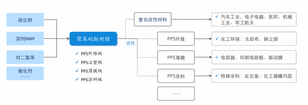 PPS的下游非常广泛。除汽车外,该材料也能应用在电子电气、机械行业、石油化工、制药业、轻工业以及军工、航空航天等特殊领域。由PPS加工而成的高性能的特种纤维和薄膜等产品,使其在环保应用领域和清洁能源领域有了更加广泛的应用。
