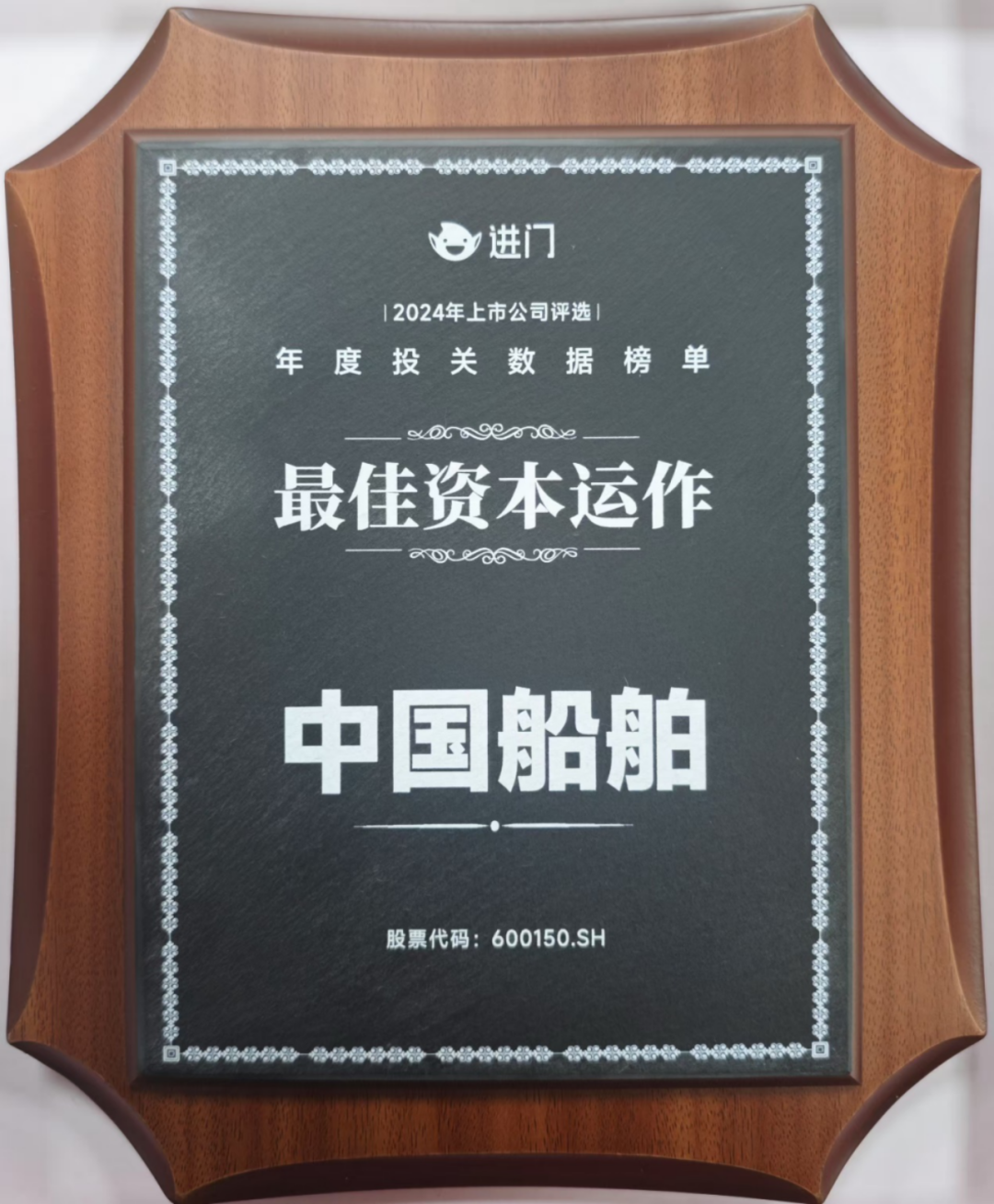 近日,进门发布“2024年上市公司评选·年度投关数据榜单”,中国船舶股份荣获“最佳资本运作奖”。此次入选体现了资本市场对公司产融发展的价值认同和投资者关系管理的工作认可。