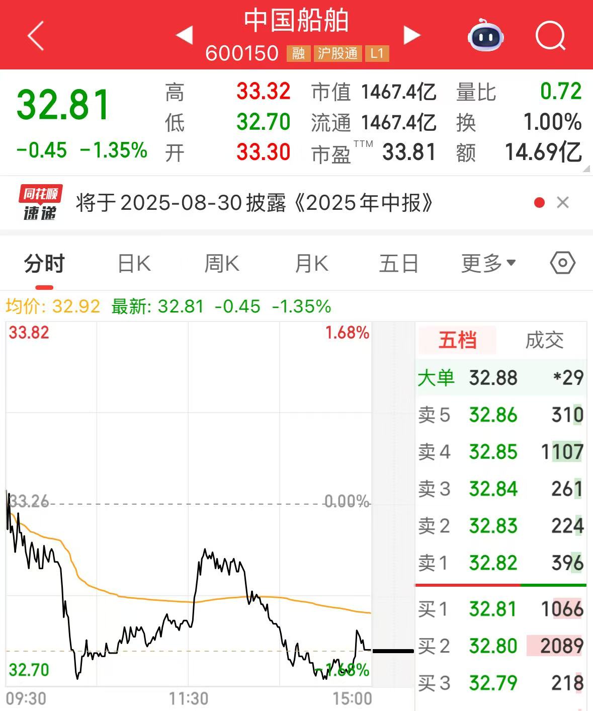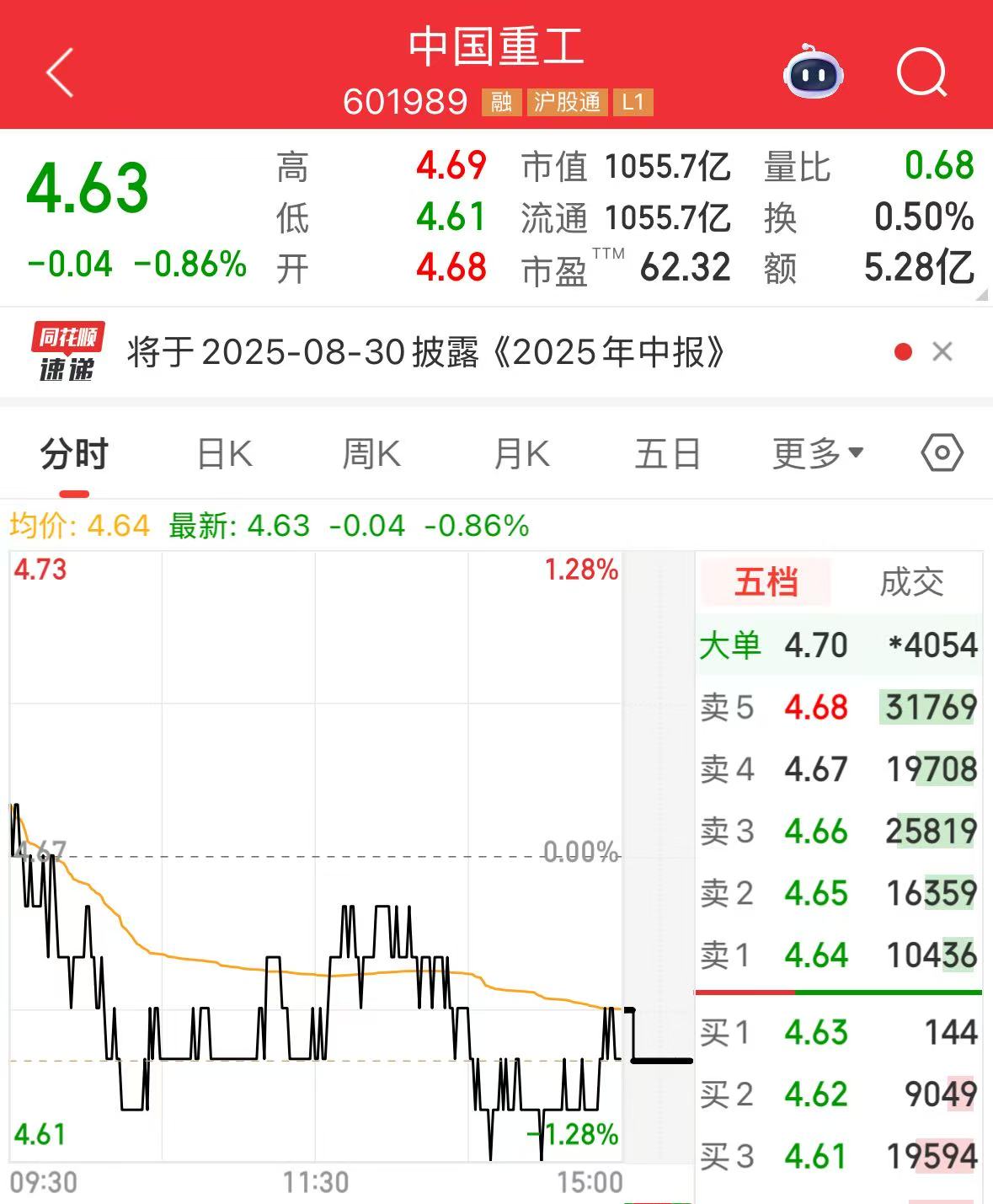 截至4日A股收盘,中国船舶股价下跌1.35%,中国重工股价下跌0.86%。