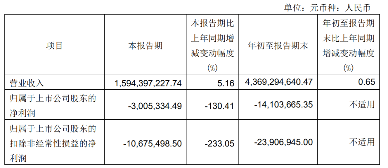 公告显示,航天机电第三季度营业收入为15.94亿元,同比增加5.16%; 属于上市股东的净利润为亏损300.53万元,同比减少130.41%。