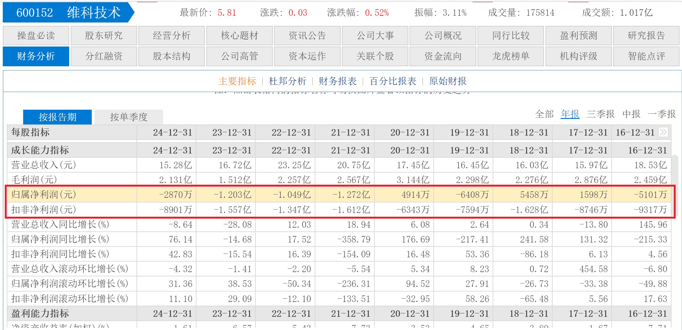 近日,维科技术发布2024年年报,公司全年营业收入15.28亿,同比下降8.64%,连续第二年下滑;实现归母净利润-0.29亿,亏损有所收窄,但连续4年亏损;扣非净利润-0.89亿,相关媒体报道称自2012年以来,维科技术的扣非净利润已连亏13年。