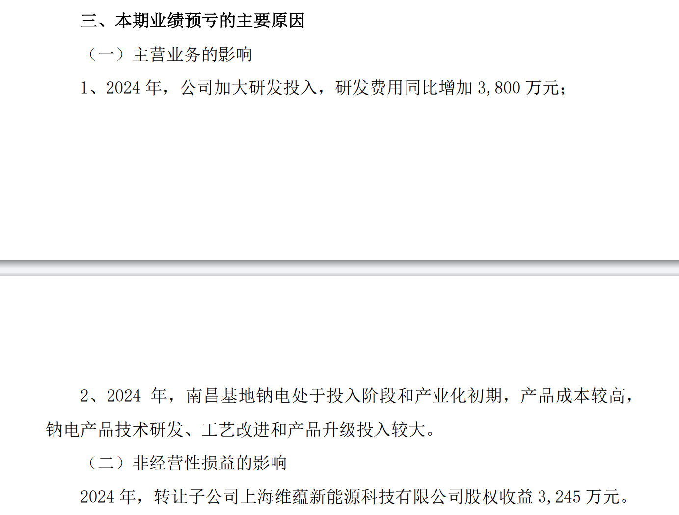 在此前发布的业绩预亏公告中,维科技术指出,2024年业绩预亏的主要因公司加大研发投入,研发费用同比增加 3,800 万元;南昌基地钠电处于投入阶段和产业化初期,产品成本较高,钠电产品技术研发、工艺改进和产品升级投入较大;转让子公司上海维蕴新能源科技有限公司股权收益 3,245 万元。