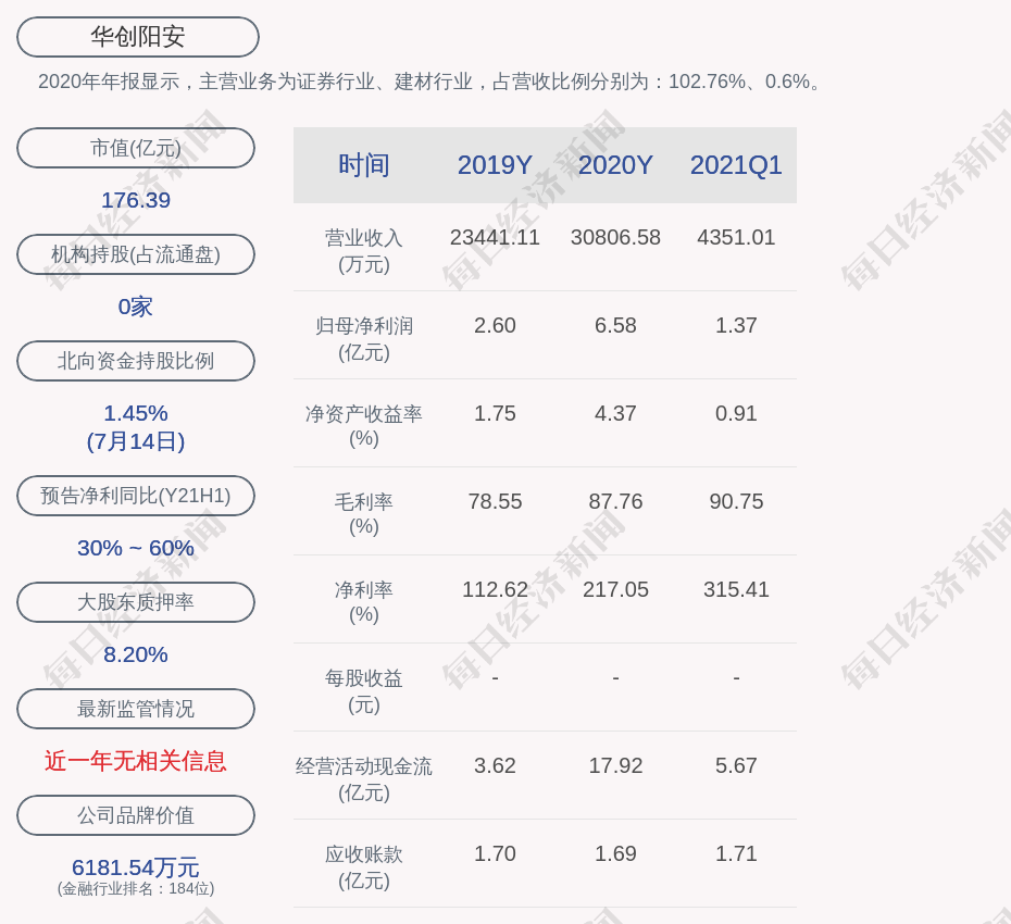 2020年年报显示,华创阳安的主营业务为证券行业、建材行业,占营收比例分别为:102.76%、0.6%。